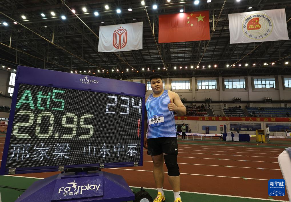 3月27日,山东中泰证券队选手邢家梁在男子铅球决赛中。他以20米95的成绩夺得冠军。