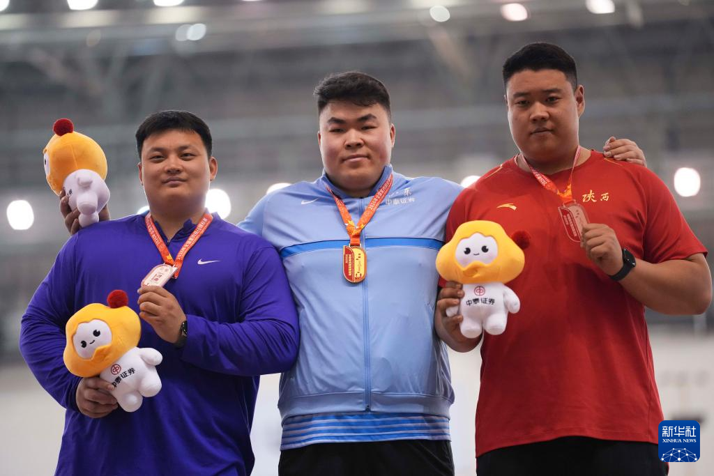 3月27日,男子铅球冠军山东中泰证券队选手邢家梁(中)、亚军四川队选手陈成雨(左)和季军陕西队选手张振宇在颁奖仪式上。