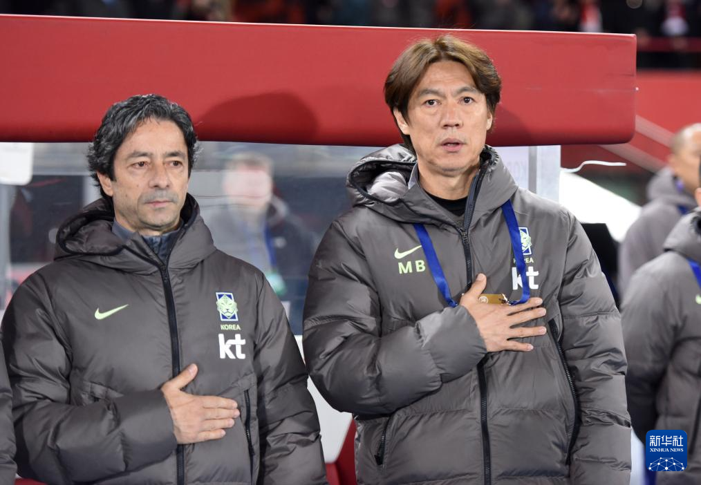 3月31日,韩国队主教练洪明浦(右)在比赛前唱国歌。