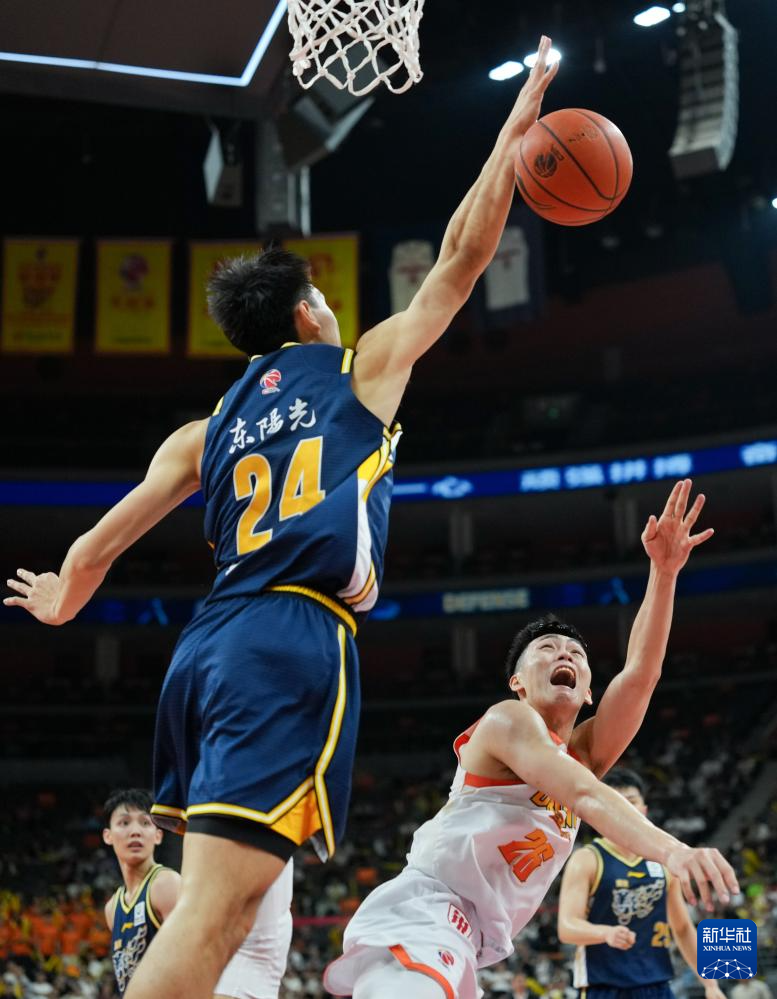 3月31日,江苏肯帝亚队球员庞峥麟(右)在比赛中上篮被广东东阳光队球员崔永熙(左)封盖。