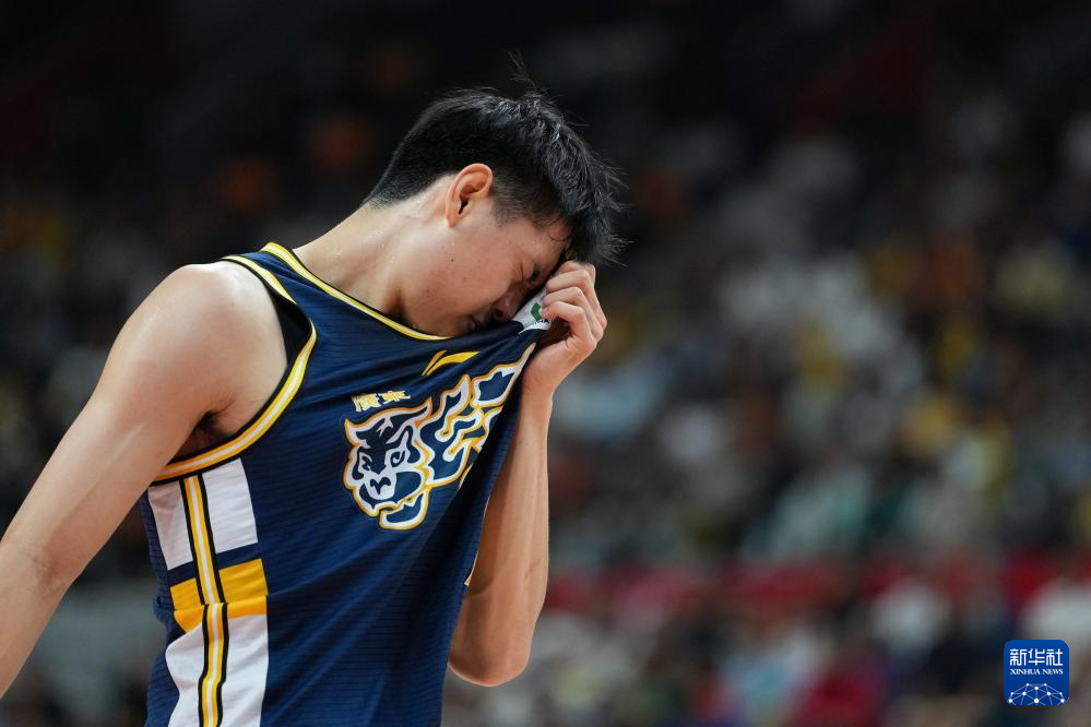 3月31日,广东东阳光队球员崔永熙在比赛中擦汗。