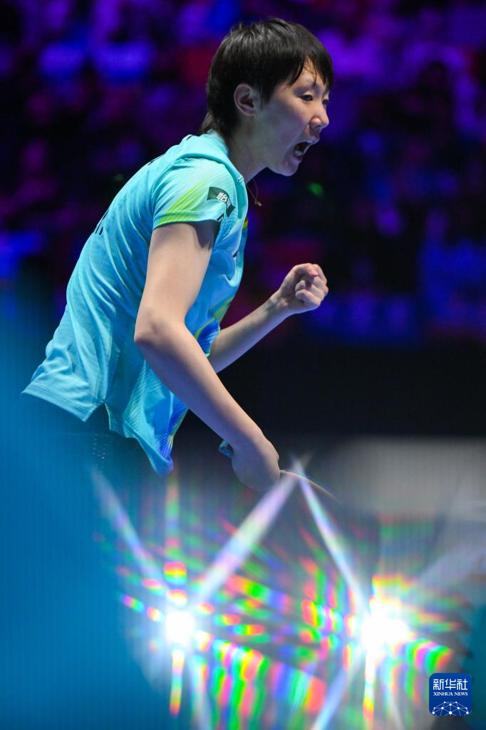 4月2日,中国选手王曼昱在比赛中庆祝得分。