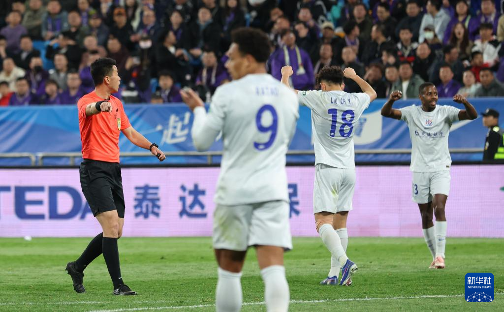 4月5日,主裁判何鑫(左)在下半场判给上海申花队一粒点球。