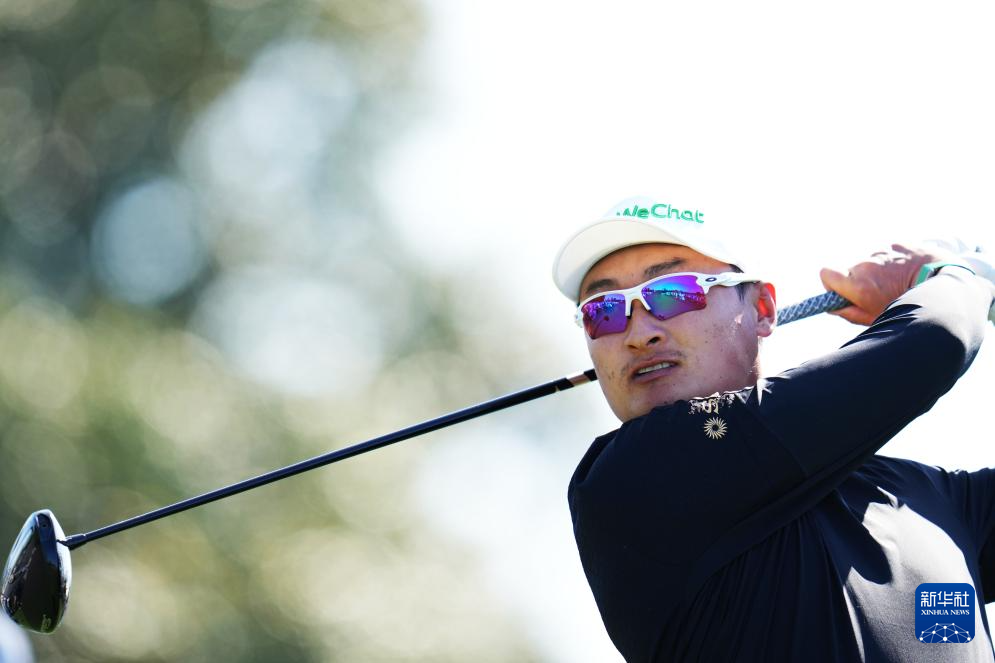 4月10日,中国选手李昊桐在比赛中开球。他以两轮140杆的总成绩暂列并列第七名。