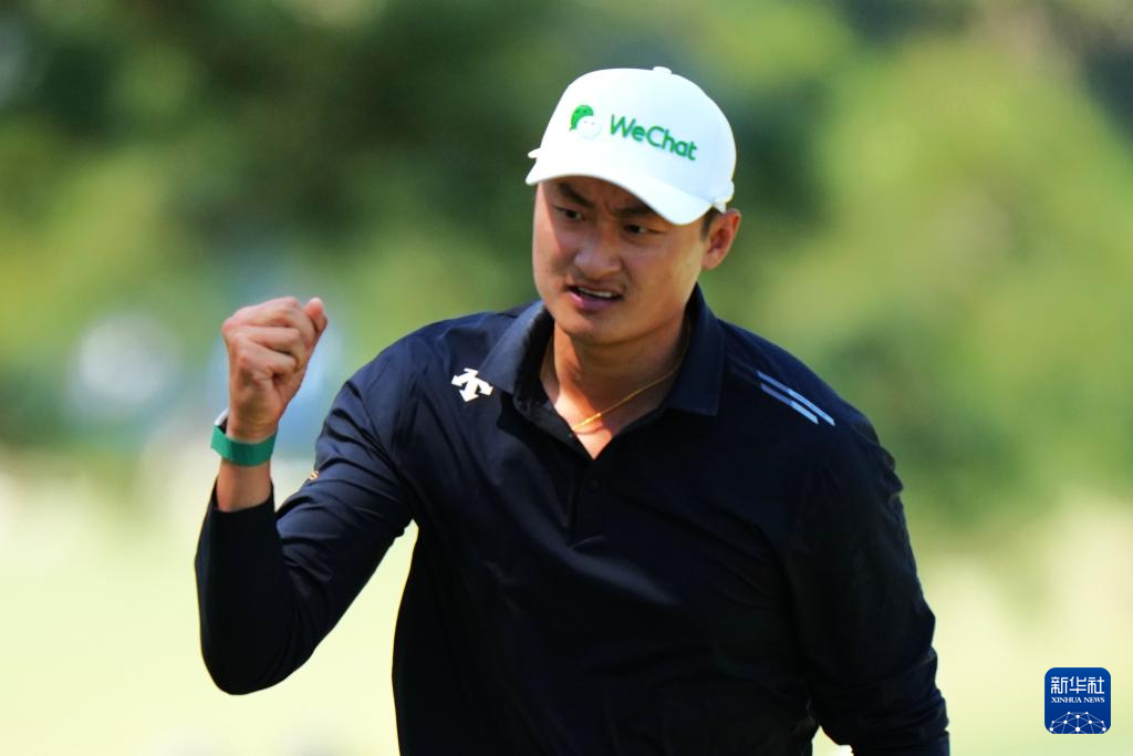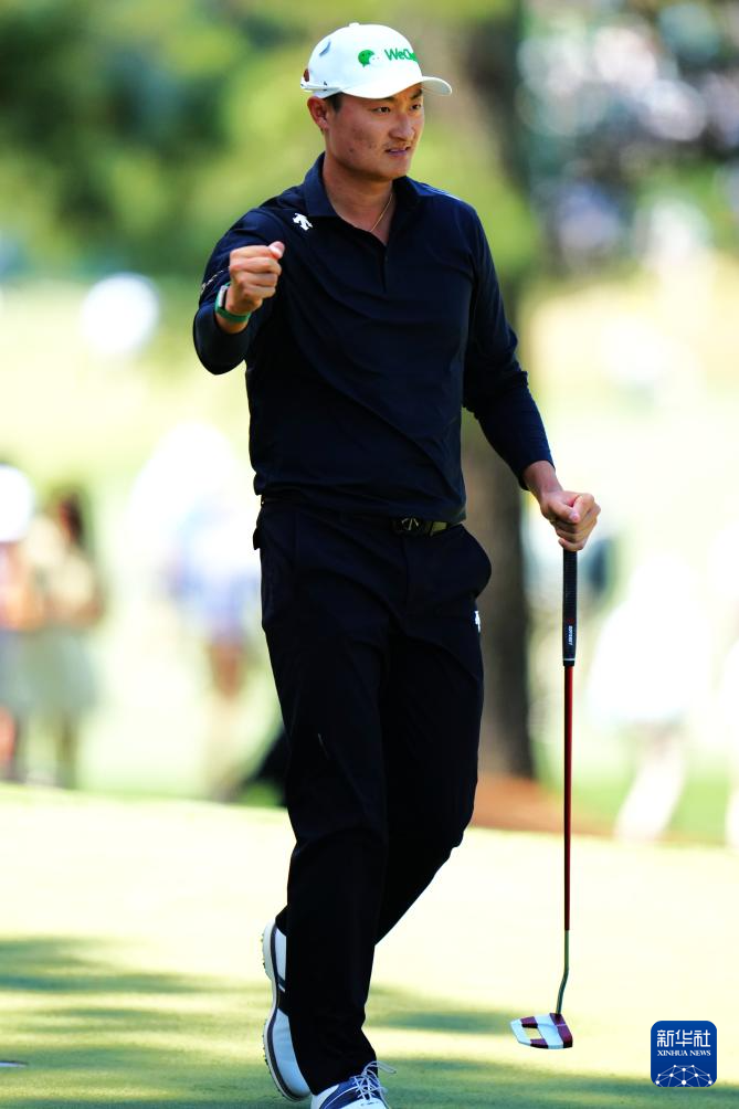 4月10日,中国选手李昊桐在比赛中庆祝。他以两轮140杆的总成绩暂列并列第七名。