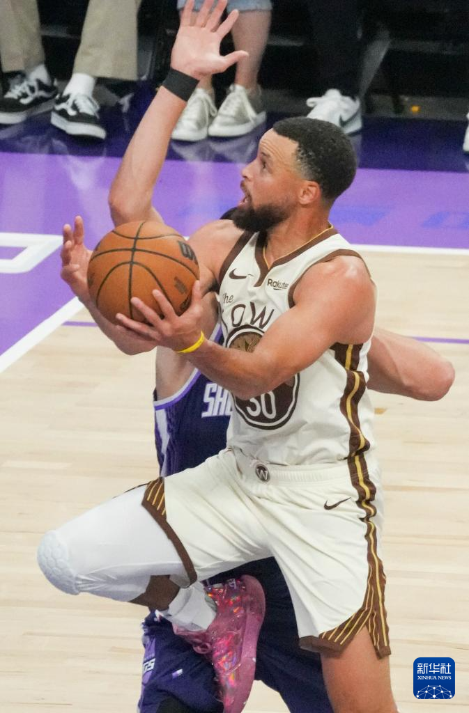 4月10日,勇士队球员斯蒂芬·库里(前)在比赛中进攻。