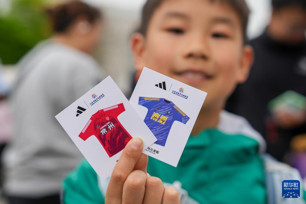 4月11日,一位小球迷展示比赛双方球衣纪念卡片。