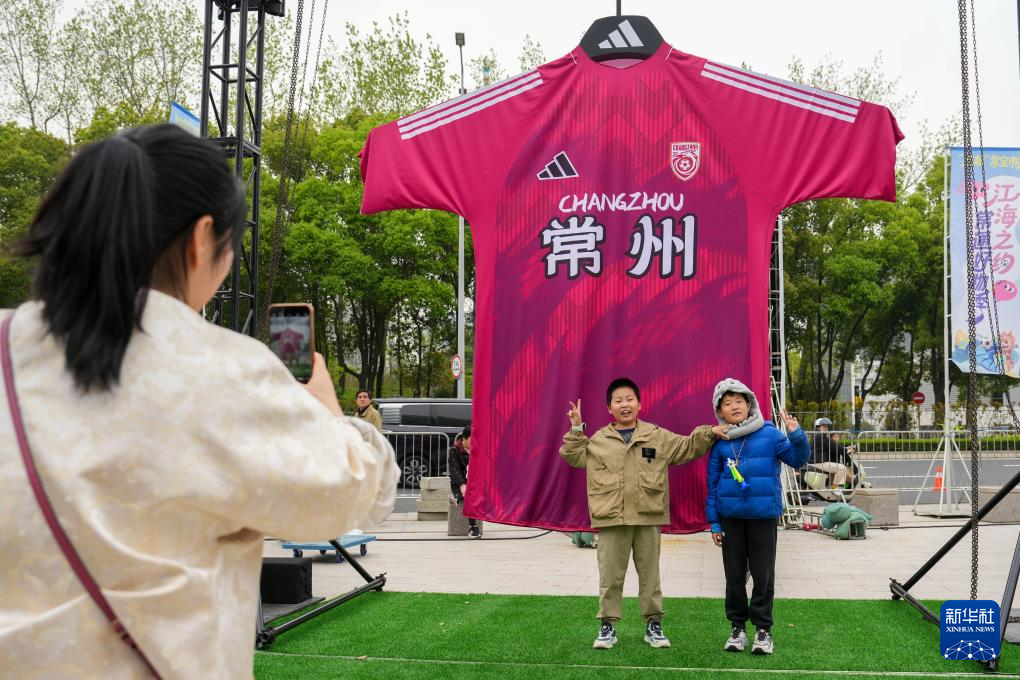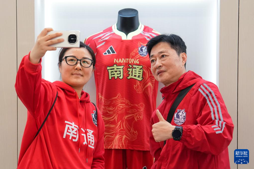 4月11日,两位南通队球迷在常州奥体中心“苏超”球衣展示区拍照留念。