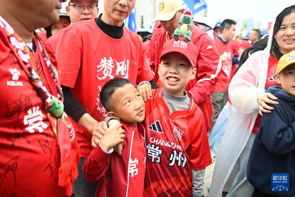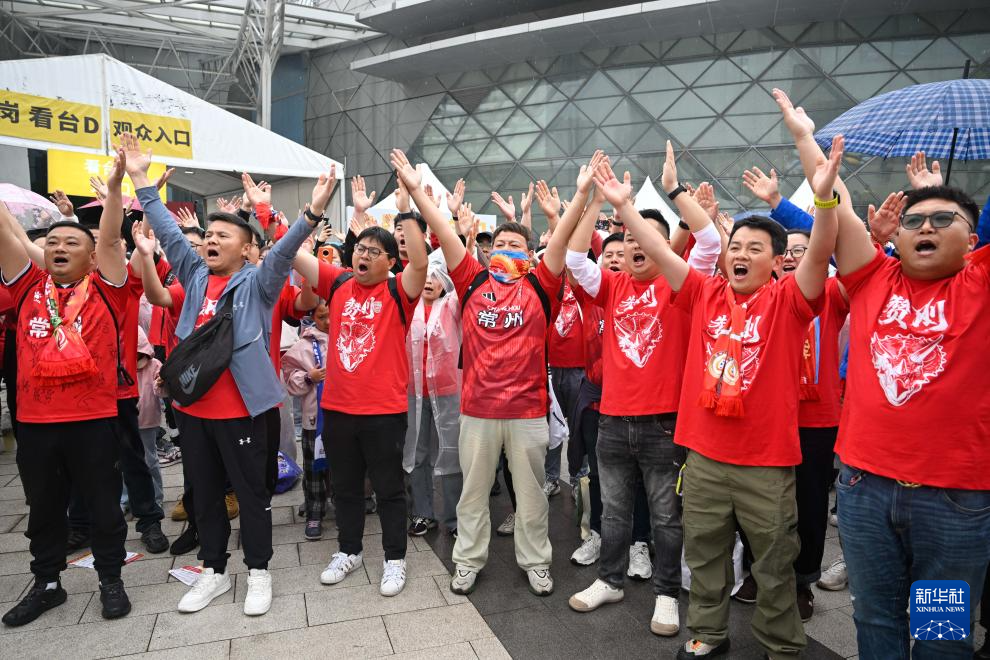 4月11日,常州队球迷在常州奥体中心体育场外为球队加油助威。