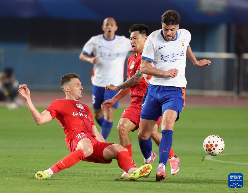 4月11日,山东泰山队球员泽卡(前右)与河南俱乐部彩陶坊队球员卢卡斯·马亚(前左)在比赛中拼抢。