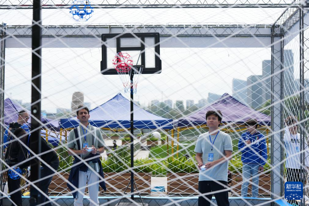4月11日,参赛选手在无人机篮球比赛中。