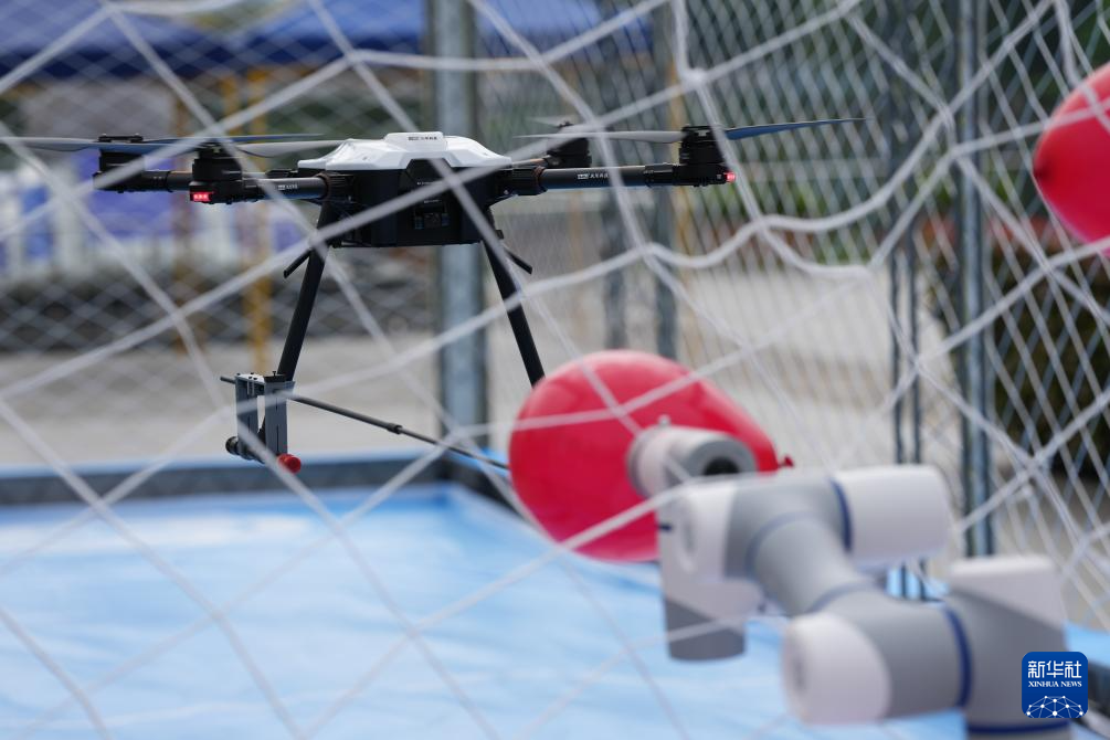 4月11日,参赛选手在无人机击剑比赛中操控无人机刺破气球。