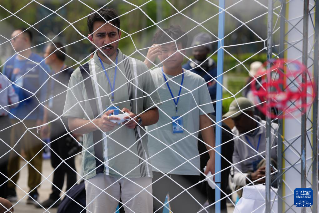 4月11日,一名学生在“未来飞手——无人机竞速赛”中操控无人机飞越障碍。