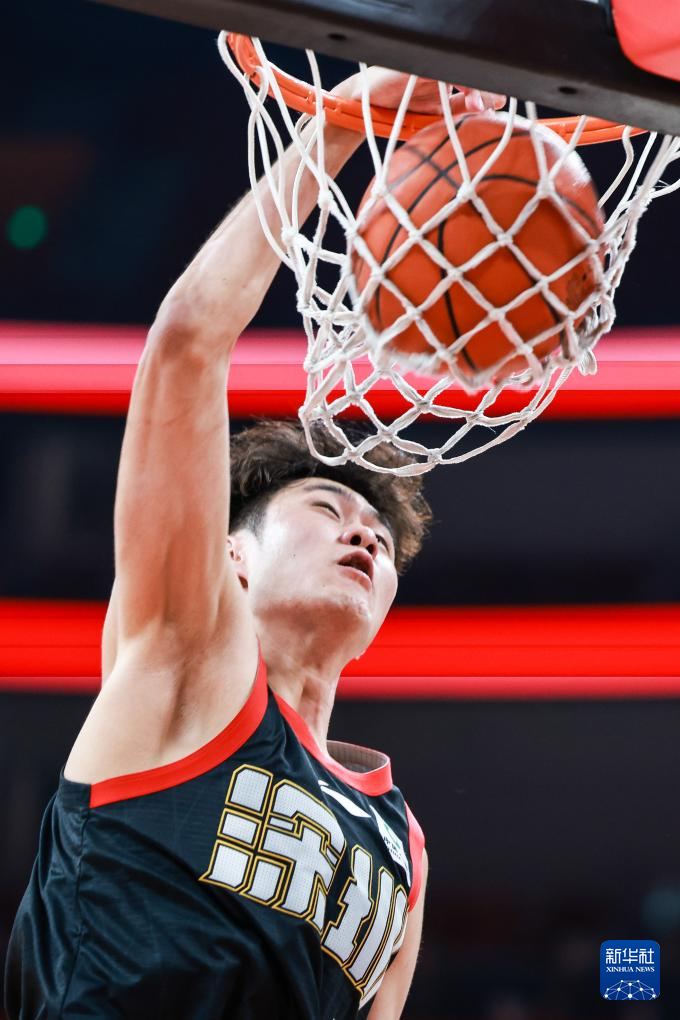 4月11日,深圳马可波罗队球员王浩然在比赛中扣篮。