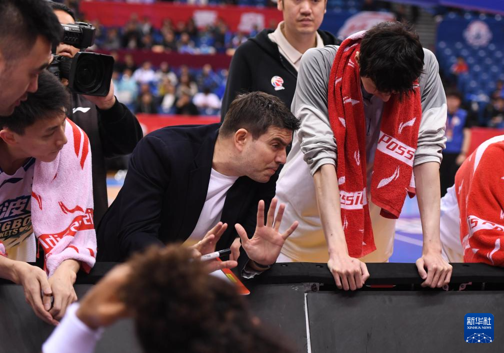 4月12日,宁波町渥队主教练哈里斯(中)在比赛间隙布置战术。