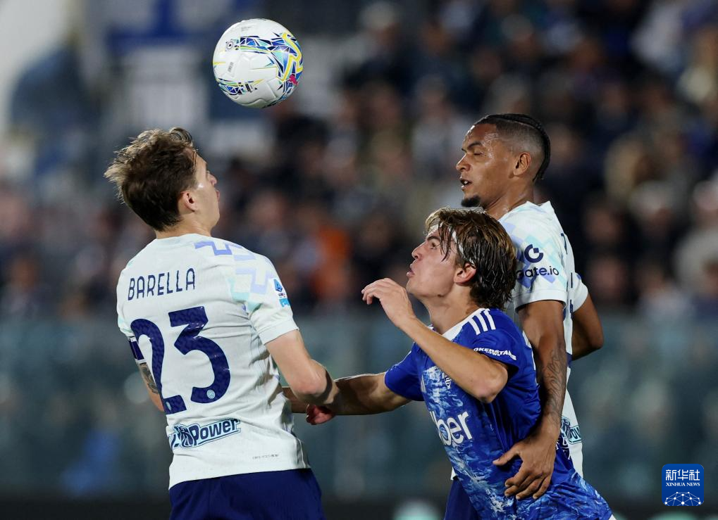 4月12日,国际米兰队球员巴雷拉(左)、阿坎吉(右)和科莫队球员尼科·帕斯在比赛中拼抢。