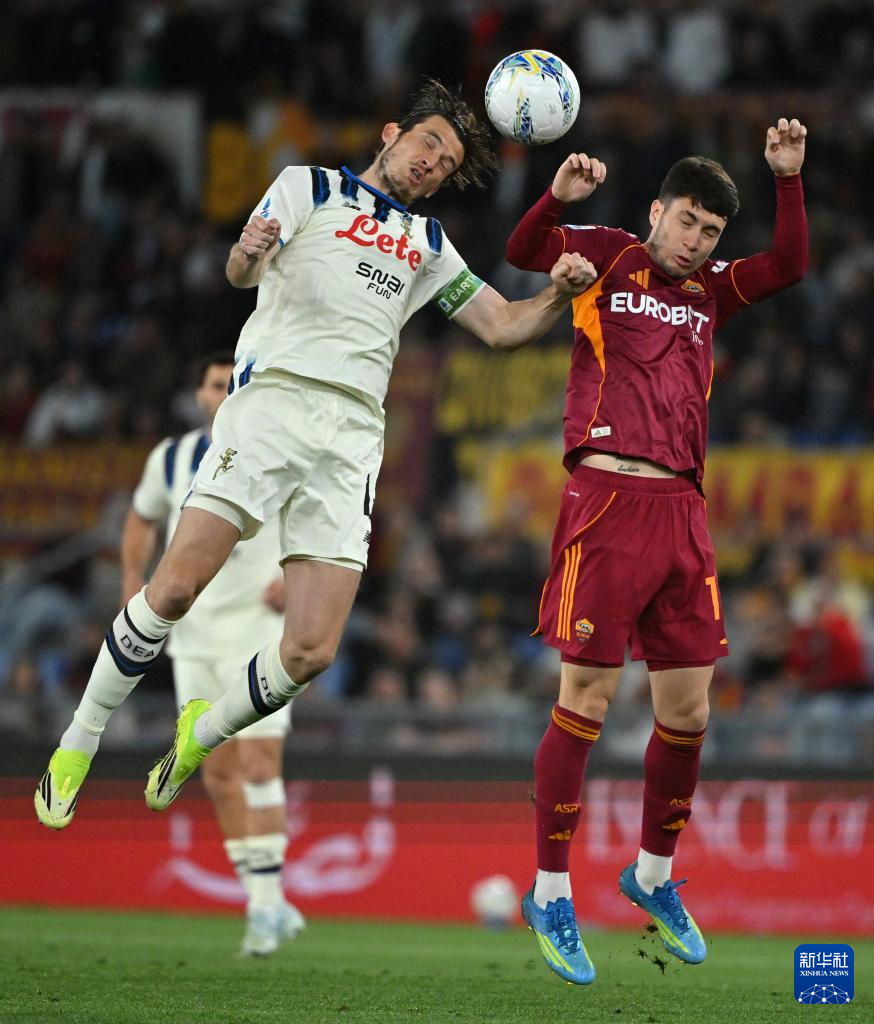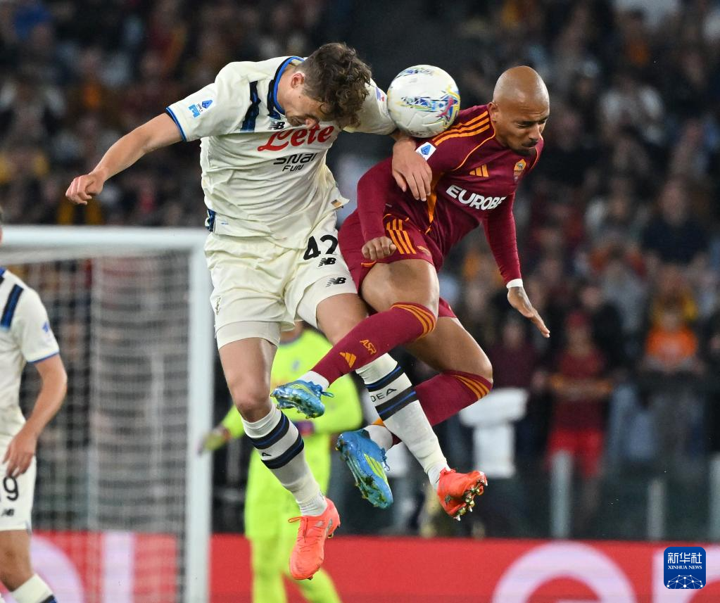 4月18日,罗马队球员苏莱(右)与亚特兰大队球员德容恩在比赛中争顶。