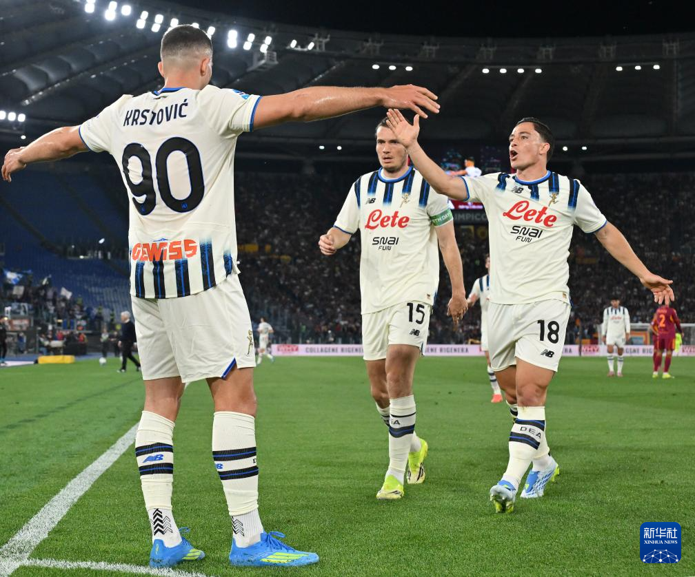 4月18日,亚特兰大队球员克尔斯托维奇(左)与队友庆祝进球。