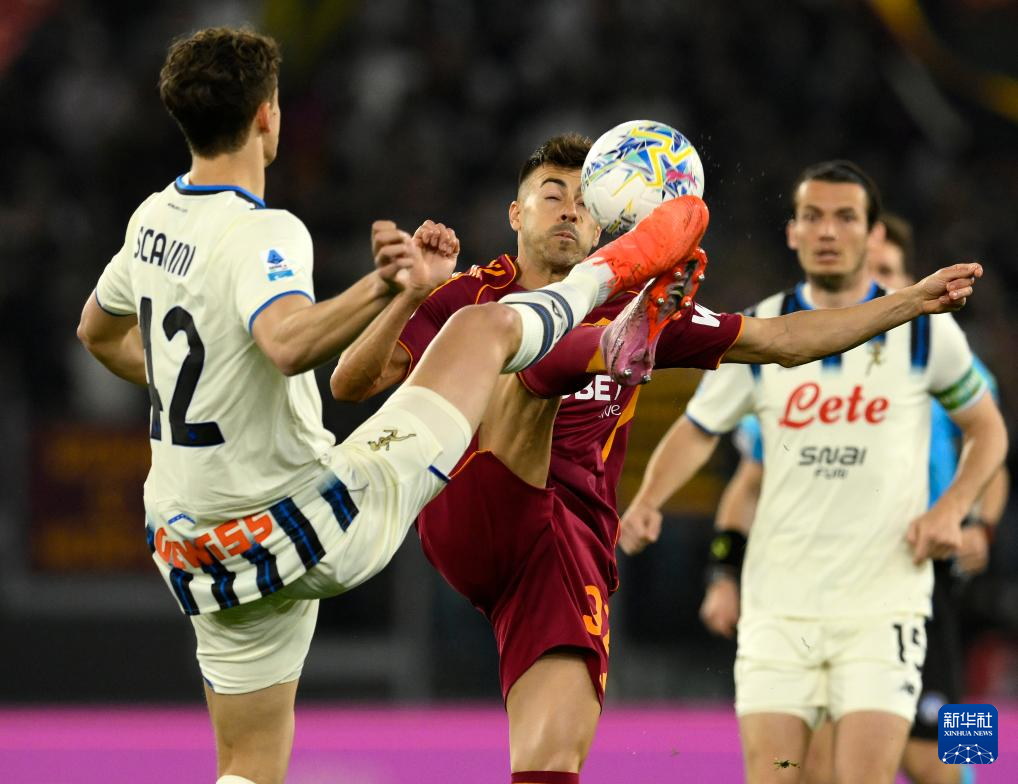 4月18日,罗马队球员沙拉维(中)与亚特兰大队球员斯卡尔维尼在比赛中拼抢。