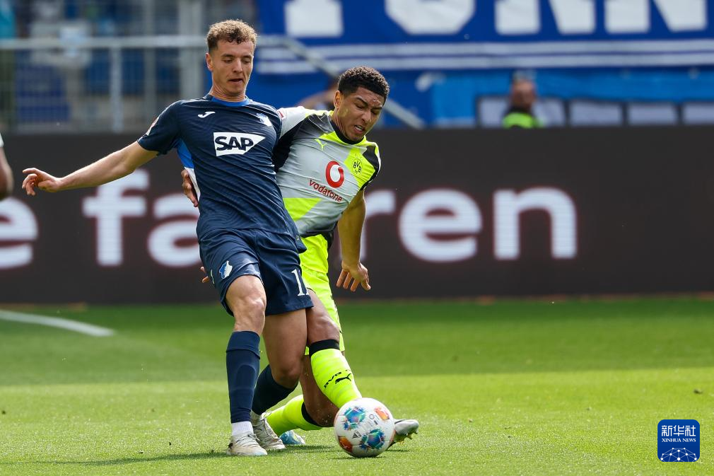 4月18日,霍芬海姆队球员阿斯拉尼(左)和多特蒙德队球员乔布·贝林厄姆在比赛中拼抢。