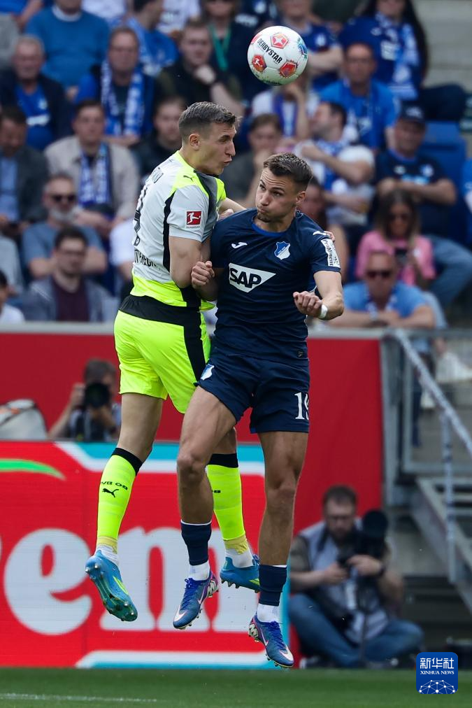4月18日,霍芬海姆队球员伦佩勒(右)和多特蒙德队球员施洛特贝克在比赛中争顶头球。