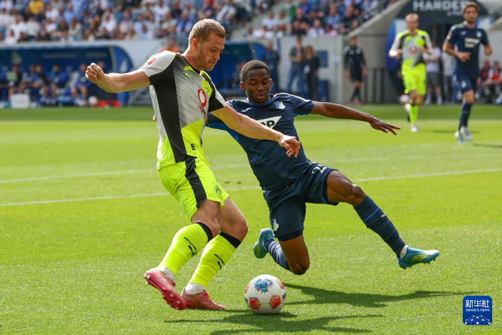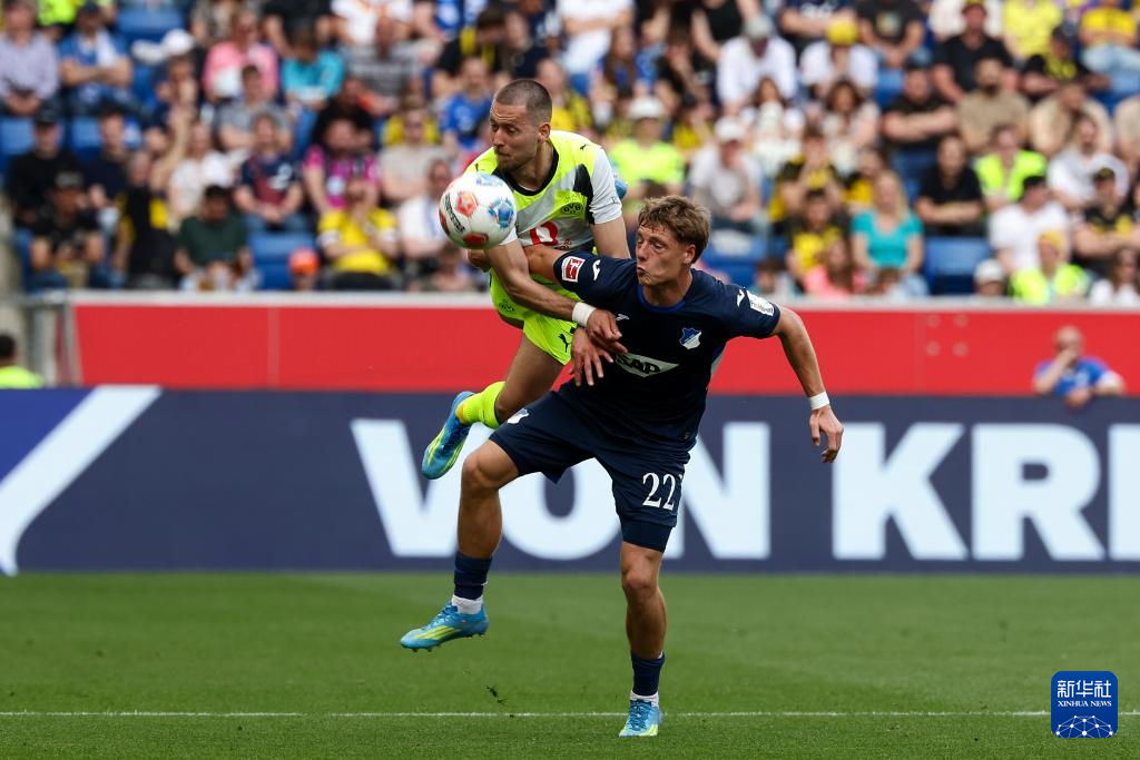 4月18日,霍芬海姆队球员杜尔(右)和多特蒙德队球员莱尔森在比赛中拼抢。