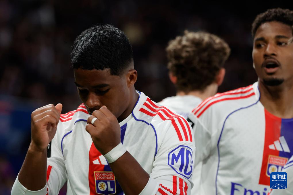 4月19日,里昂队球员恩德里克(左)在进球后庆祝。