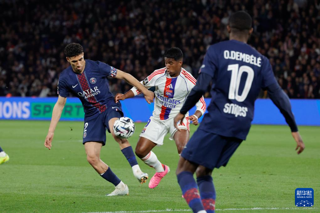 4月19日,巴黎圣日耳曼队球员阿什拉夫·哈基米(左)和里昂队球员恩德里克在比赛中拼抢。