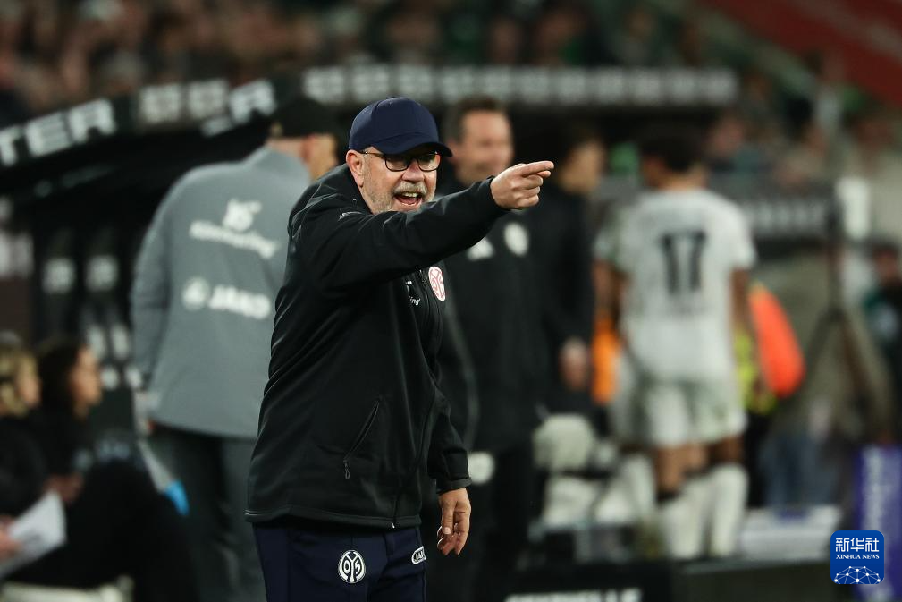 4月19日,美因茨队主教练菲舍尔在场边指挥。