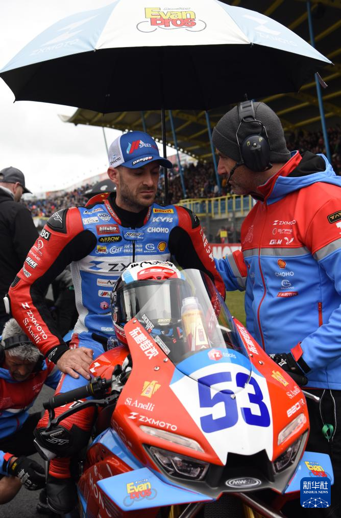 4月19日,“张雪机车”车队法国车手瓦伦丁·德比斯在比赛前与车队工作人员交谈。