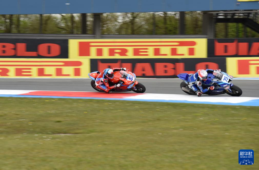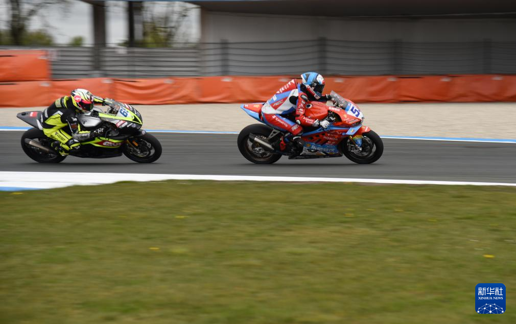 4月19日,“张雪机车”车队法国车手瓦伦丁·德比斯(左)在比赛中。