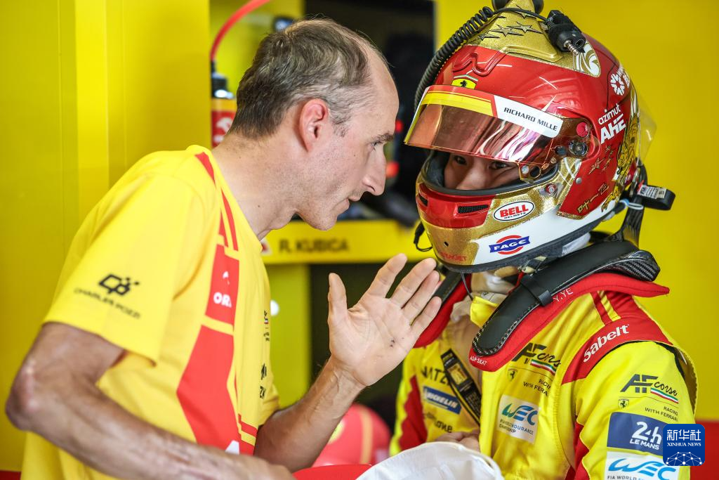 4月19日,法拉利车队中国车手叶一飞(右)在赛前与队友、前F1车手罗伯特·库比卡交谈。