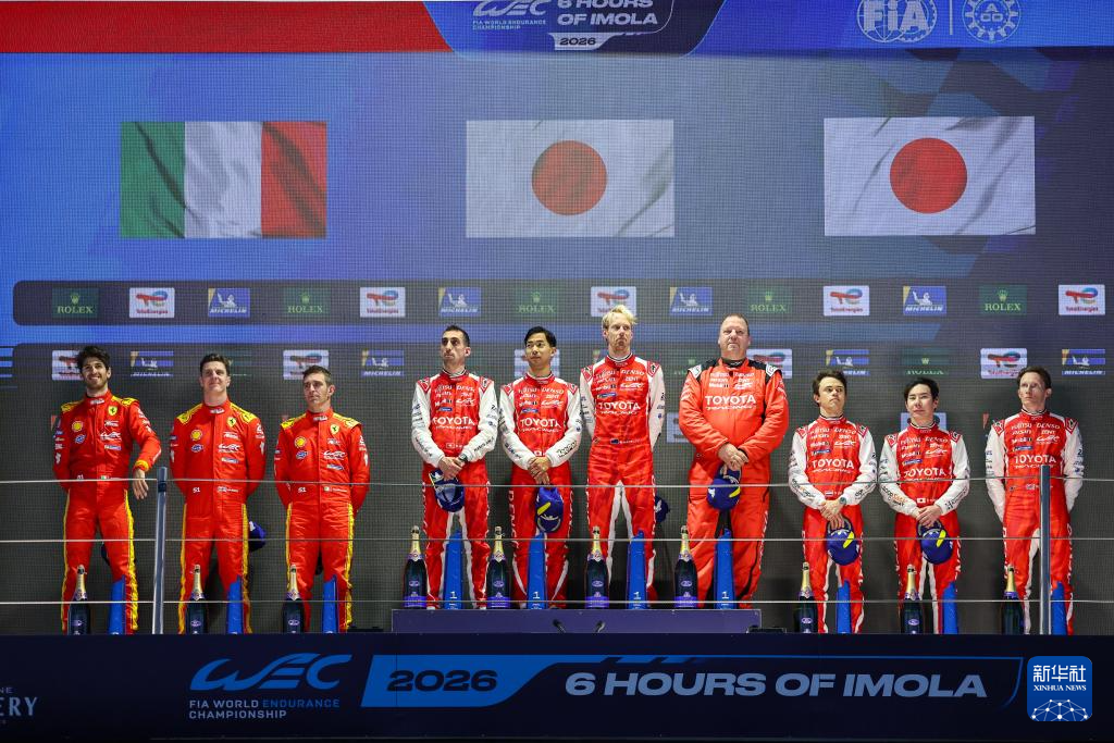 4月19日,冠军丰田车队8号赛车车手(中)、亚军法拉利车队51号赛车车手(左)和季军丰田车队7号赛车车手在颁奖仪式上。
