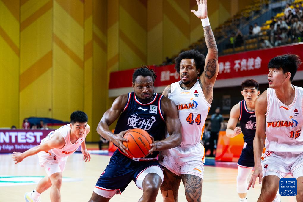 4月20日,广州朗肽海本队球员伯顿(前)在比赛中突破福建晋江文旅队球员布里斯科的防守。
