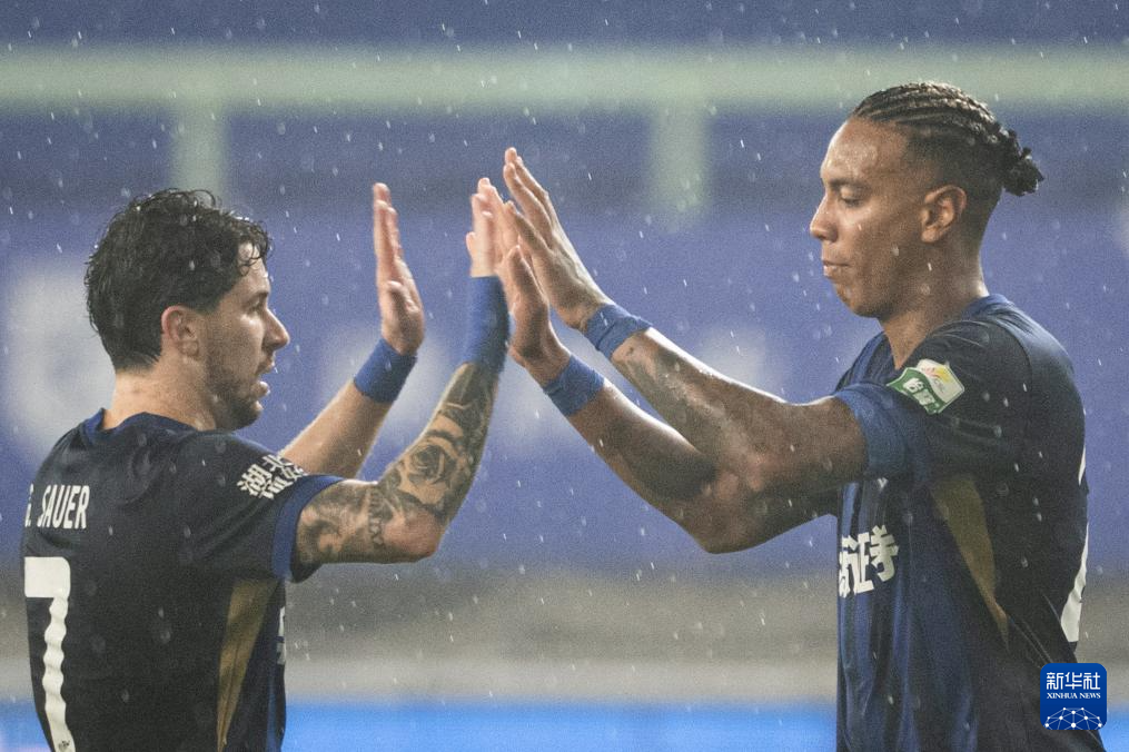 4月21日,武汉三镇队球员贝维斯(右)在比赛中与队友卡迪斯庆祝进球。
