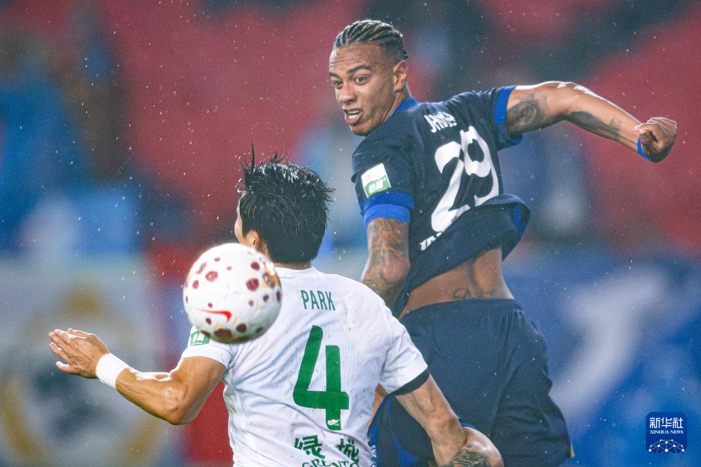 4月21日,武汉三镇队球员卡迪斯(右)在比赛中与浙江俱乐部绿城队球员朴镇燮争顶。