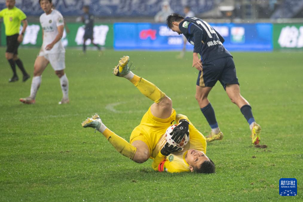 4月21日,浙江俱乐部绿城队守门员赵博(前)在比赛中扑救险球。
