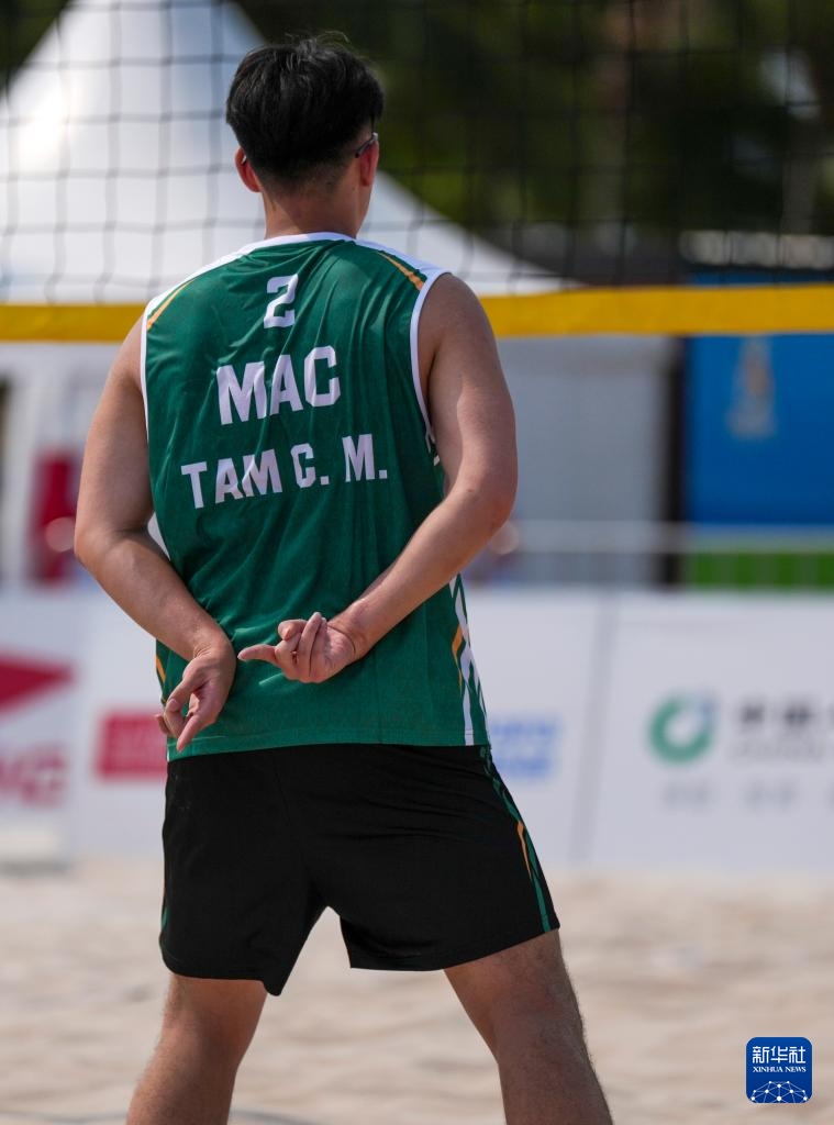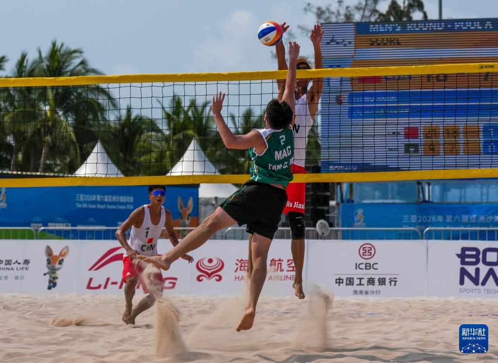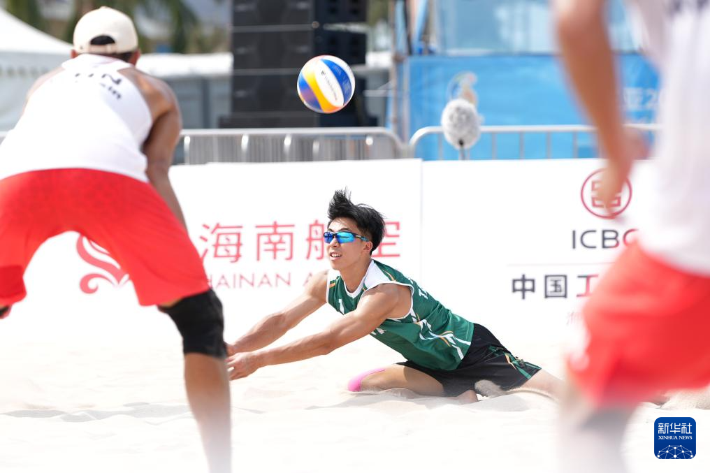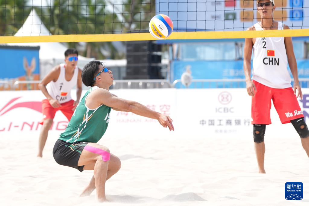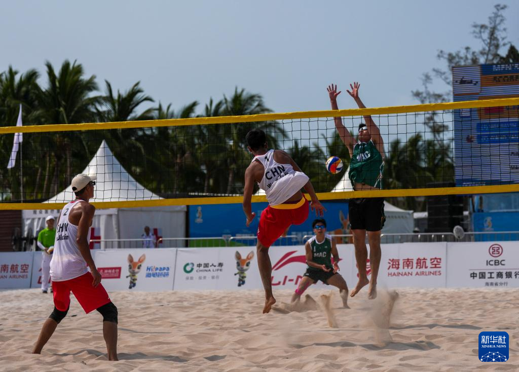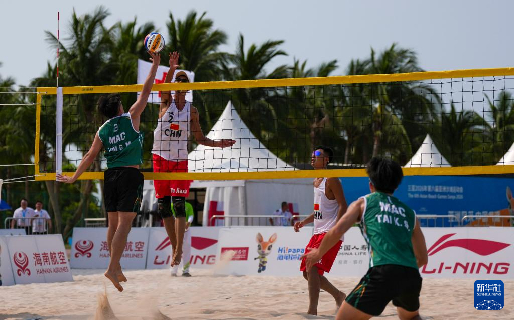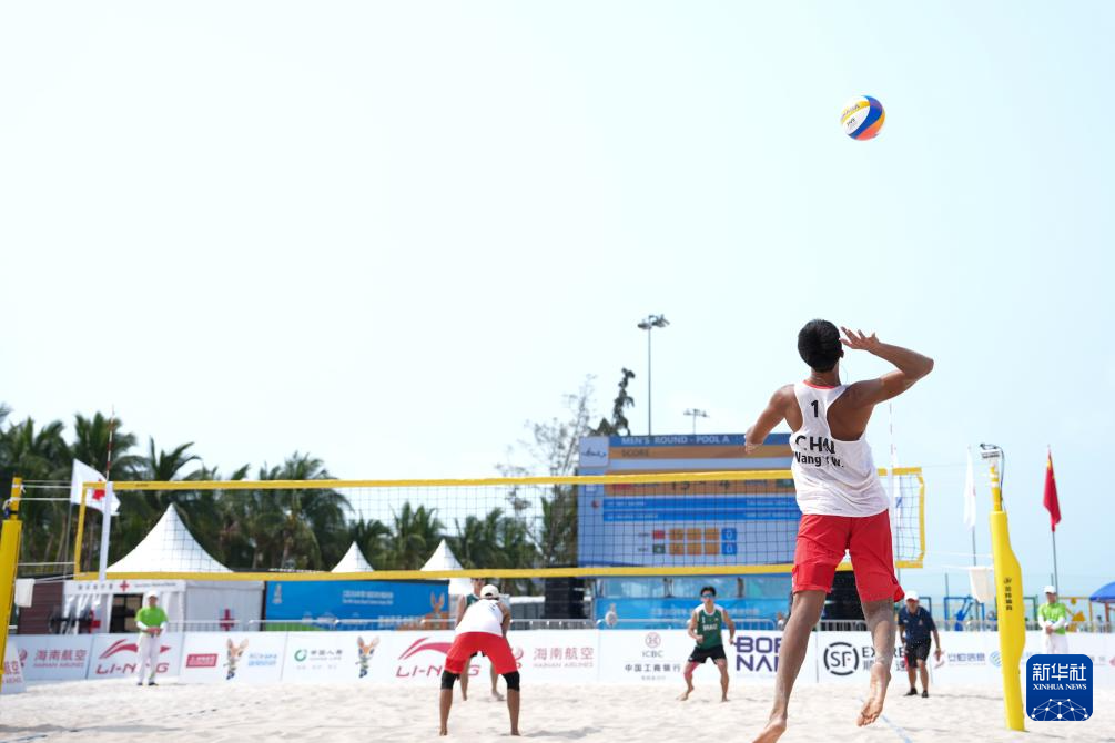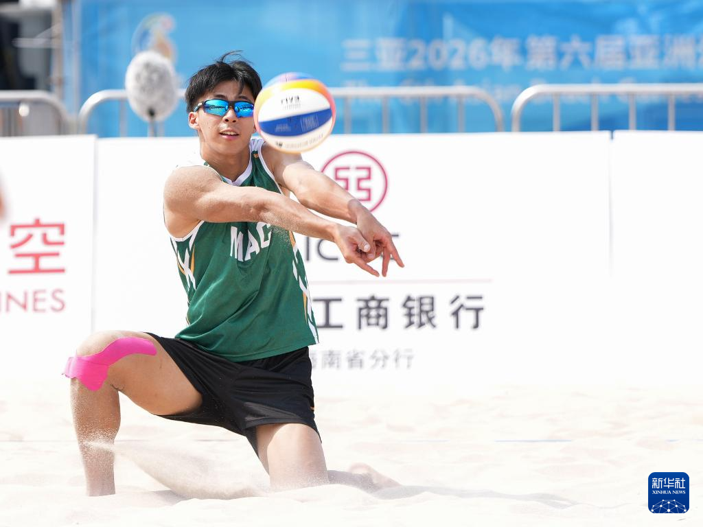 4月23日,在海南三亚举行的第六届亚洲沙滩运动会沙滩排球男子小组赛中,中国组合吴佳欣/王延伟2比0战胜中国澳门组合戴坤铖/谭哲明。