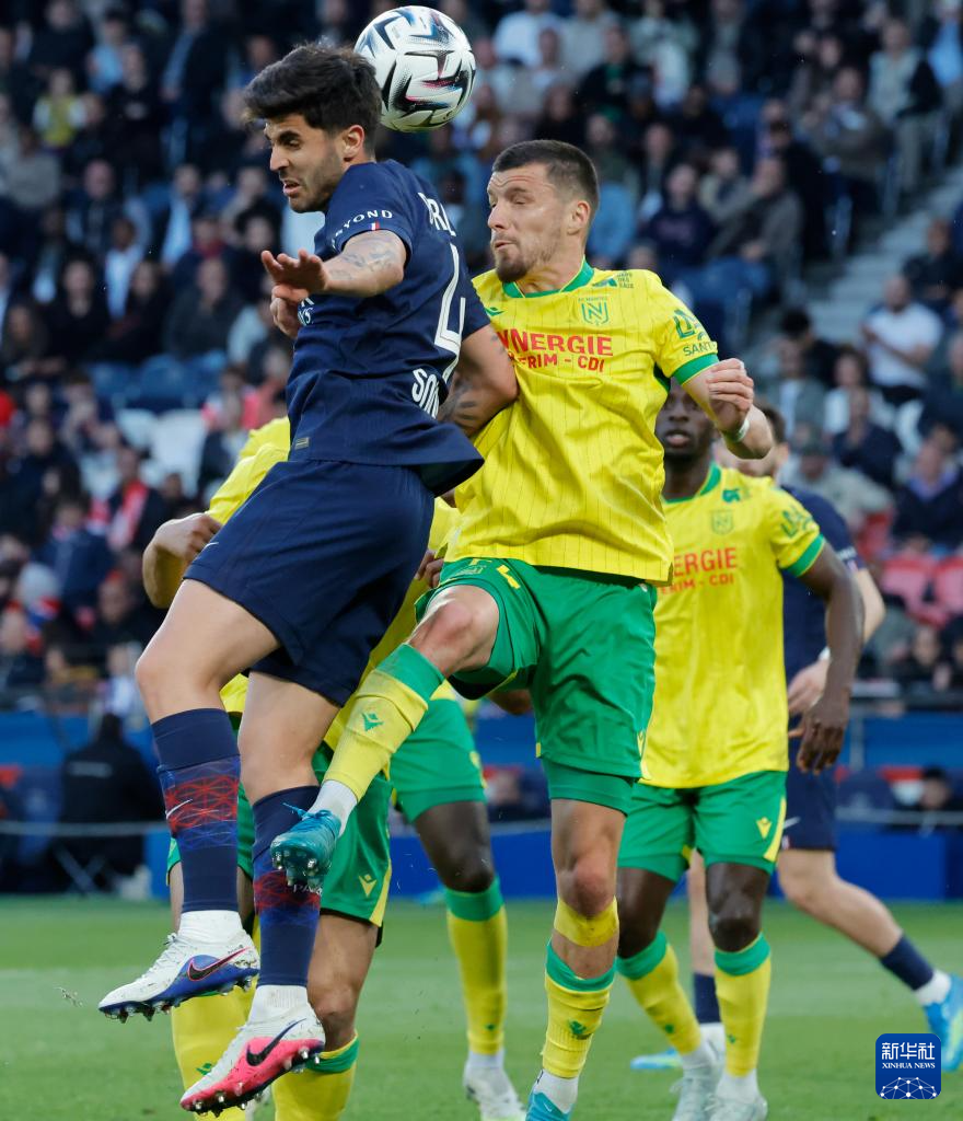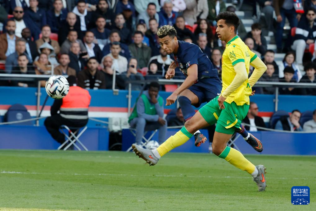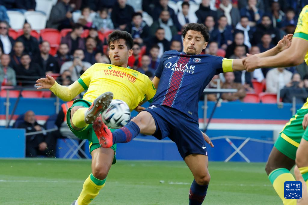 4月22日,巴黎圣日耳曼队球员马尔基尼奥斯(右)和南特队球员优素福在比赛中拼抢。