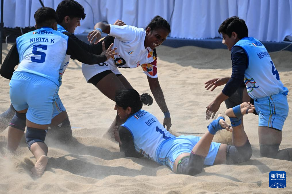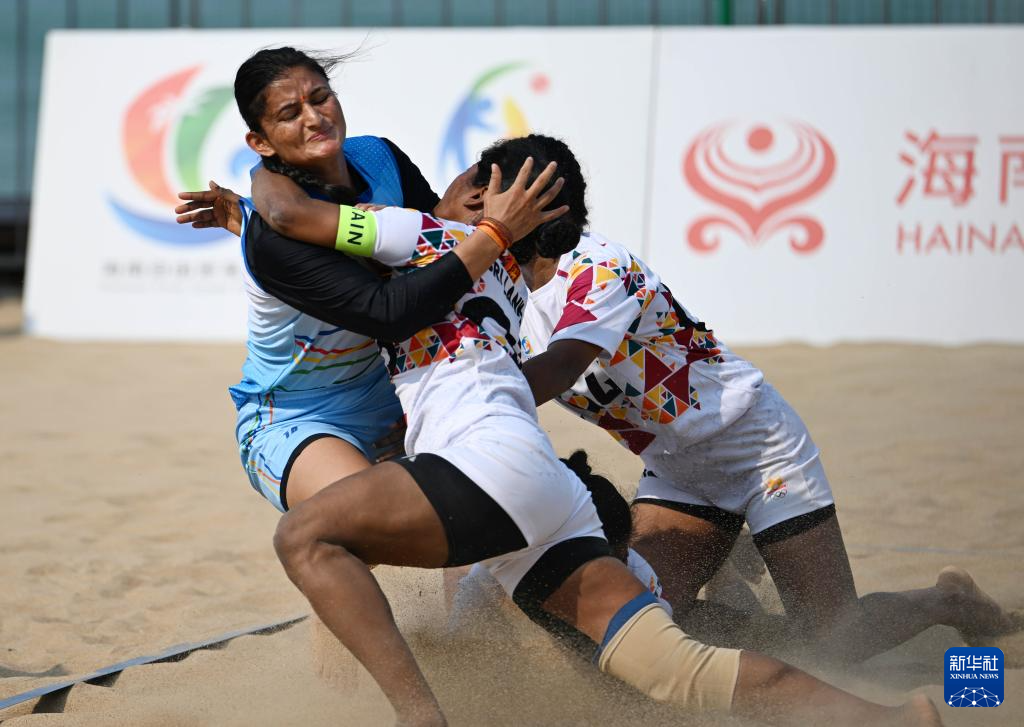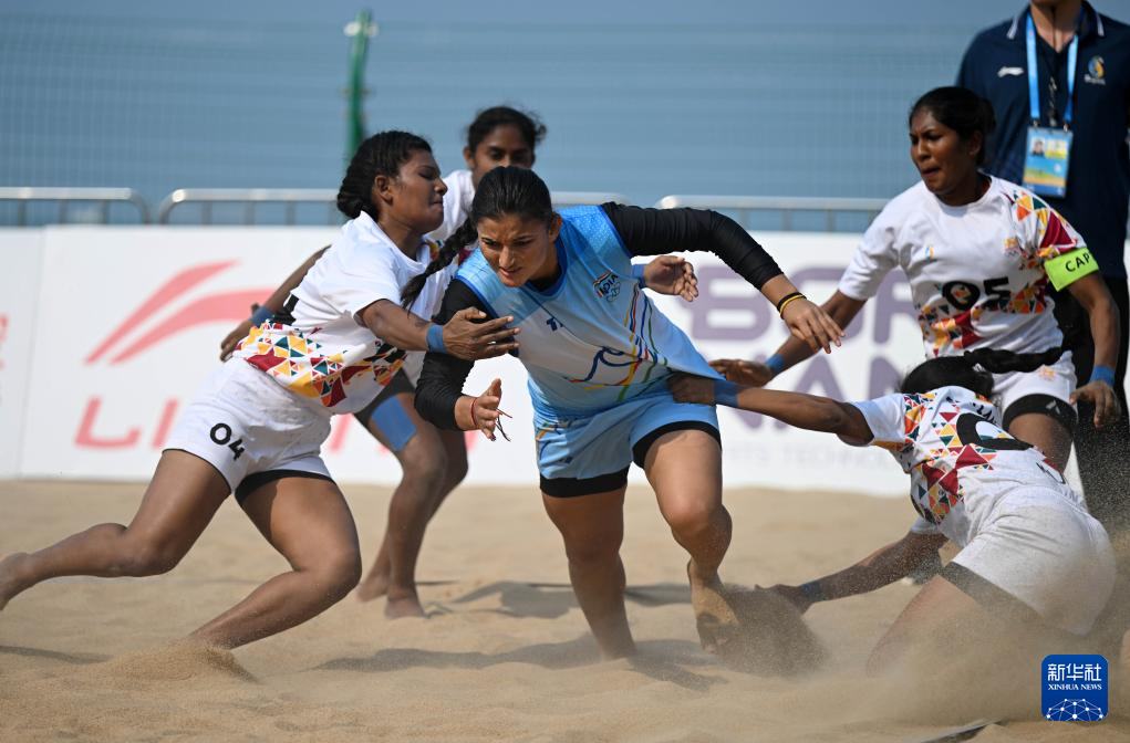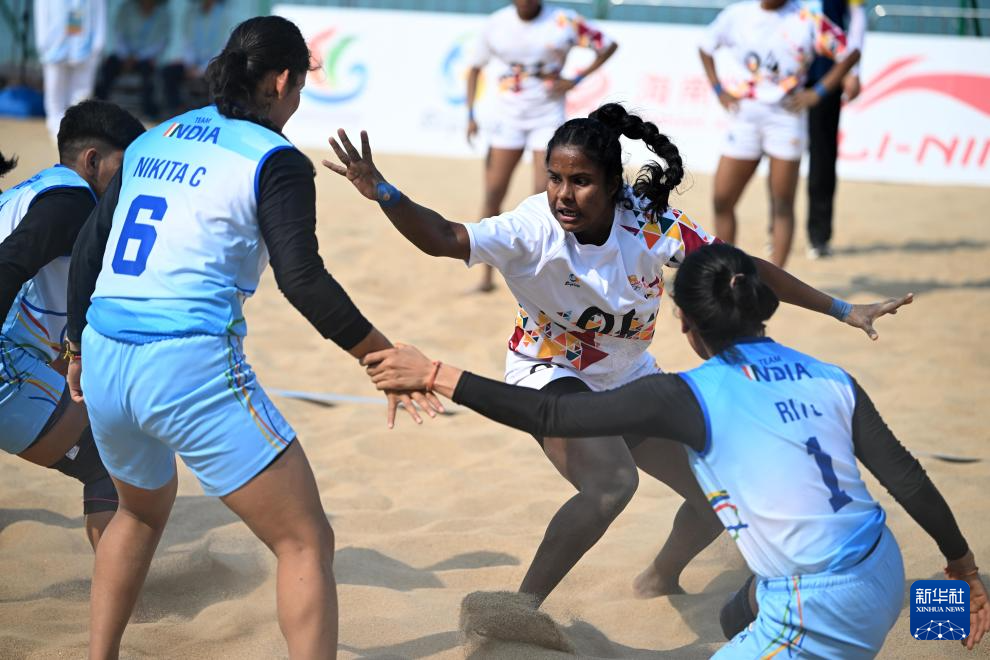 4月23日,在海南三亚举行的第六届亚洲沙滩运动会沙滩卡巴迪女子小组赛中,印度队44比32战胜斯里兰卡队。