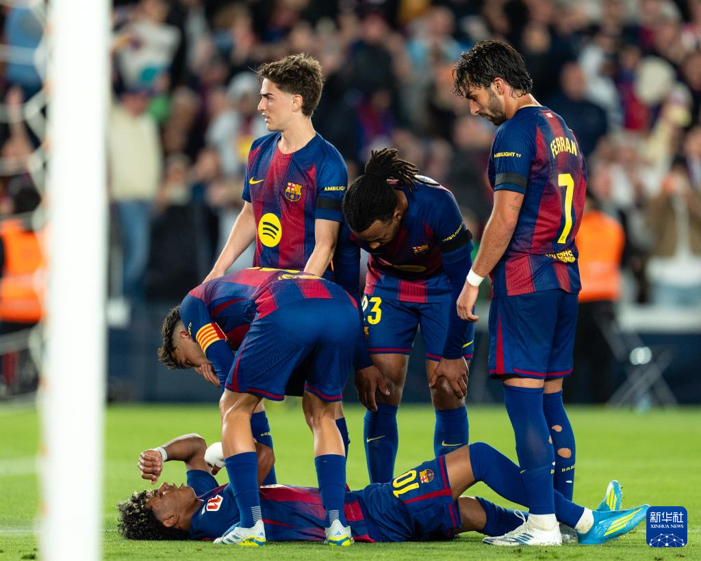 4月22日,巴塞罗那队球员亚马尔(下)在比赛中受伤。