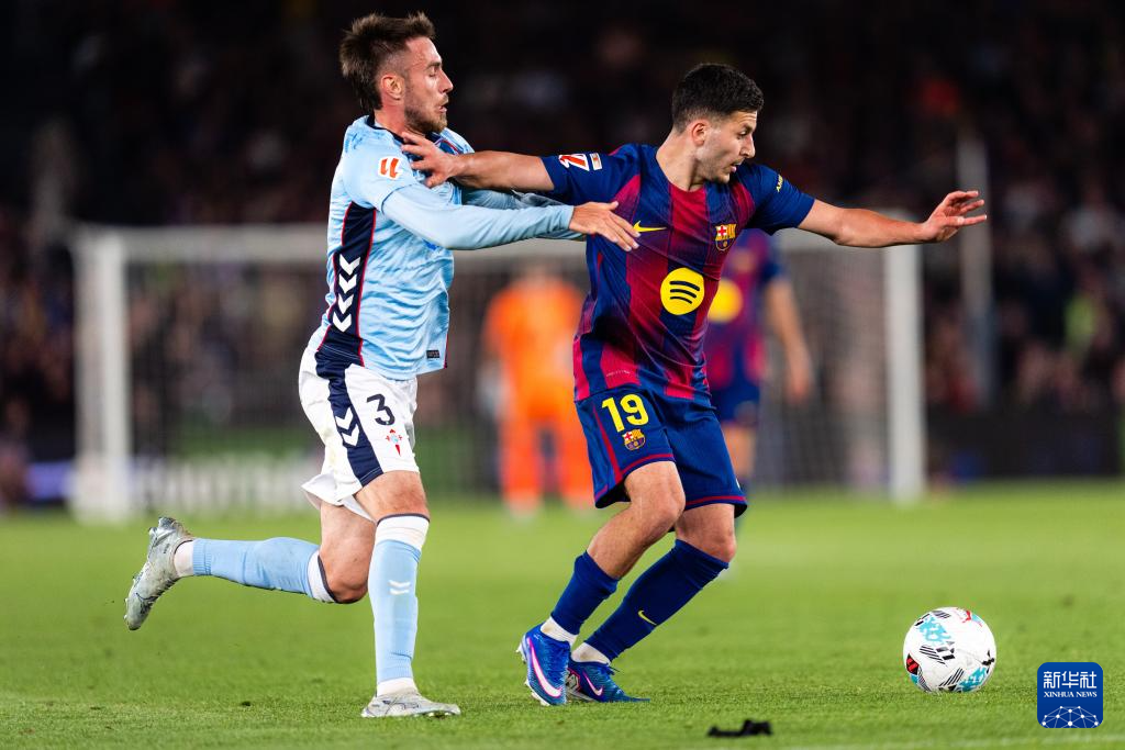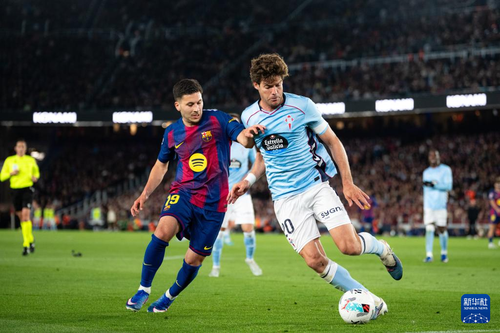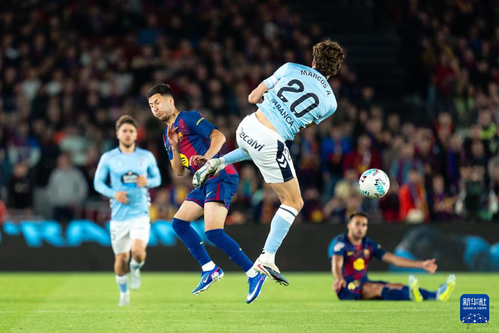 4月22日,巴塞罗那队球员巴尔德格吉(右)和塞尔塔队球员明格萨在比赛中拼抢。