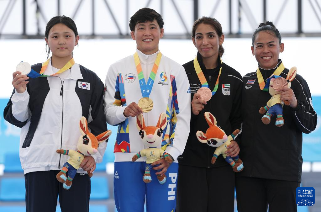 4月23日,女子63公斤级冠军菲律宾选手亚历山德里亚·卢斯·恩里克斯(左二)、亚军韩国选手李妍智(左一)、季军阿联酋选手沙玛·卡勒巴尼(右二)和泰国选手奥拉帕·塞纳坦在颁奖仪式上。
