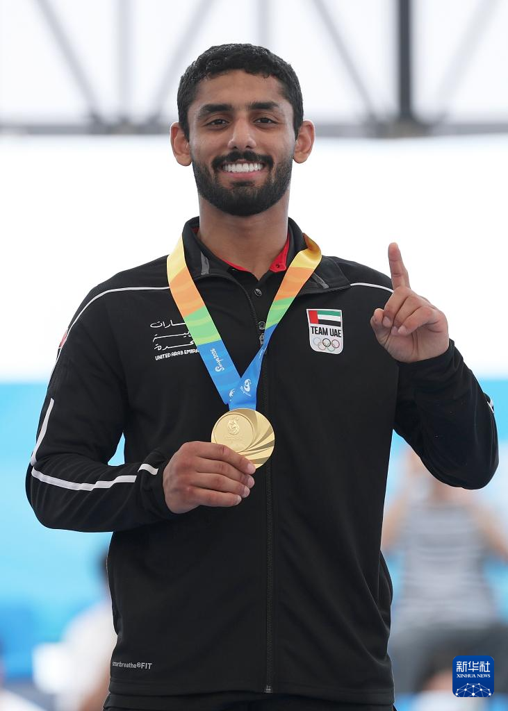 4月23日,男子62公斤级冠军阿联酋选手哈立德·阿尔谢希在颁奖仪式上。