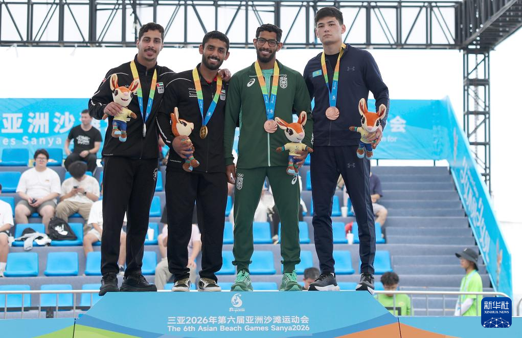 4月23日,男子62公斤级冠军阿联酋选手哈立德·阿尔谢希(左二)、亚军阿联酋选手奥马尔·阿尔苏韦迪(左一)、季军沙特选手阿卜杜勒马利克·阿尔穆尔迪(右二)和哈萨克斯坦选手巴特尔·特尼兹巴伊在颁奖仪式上。