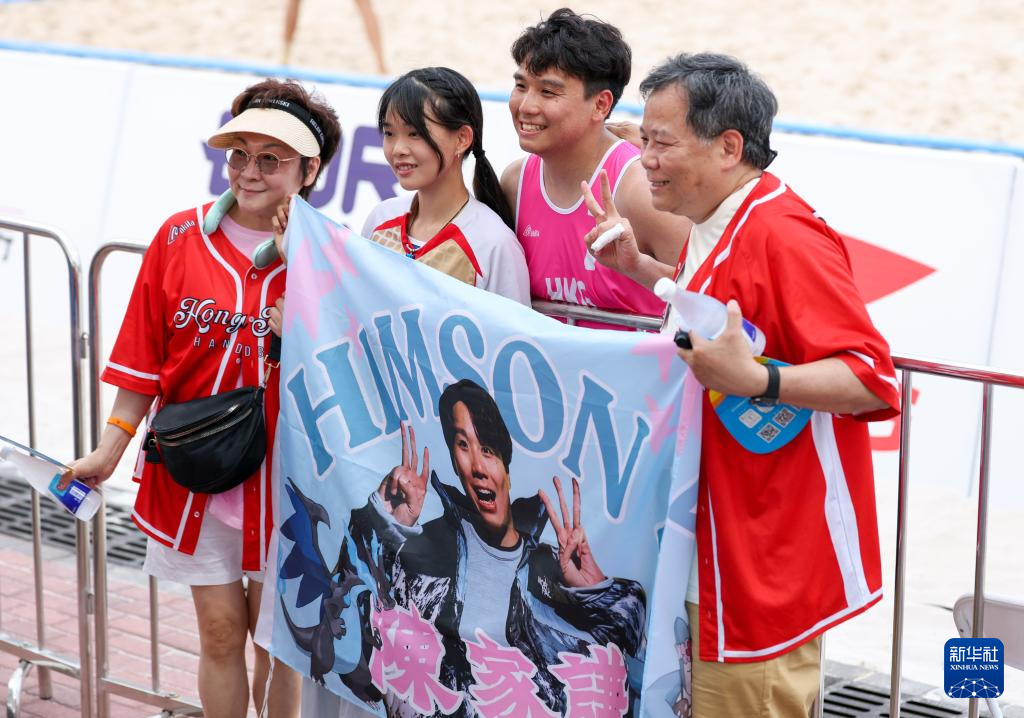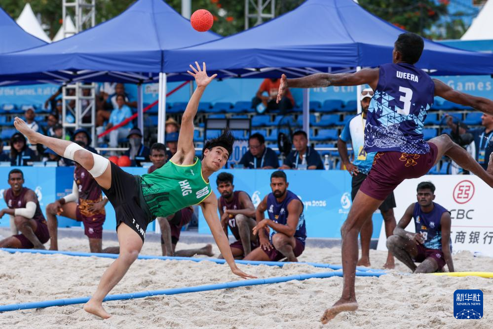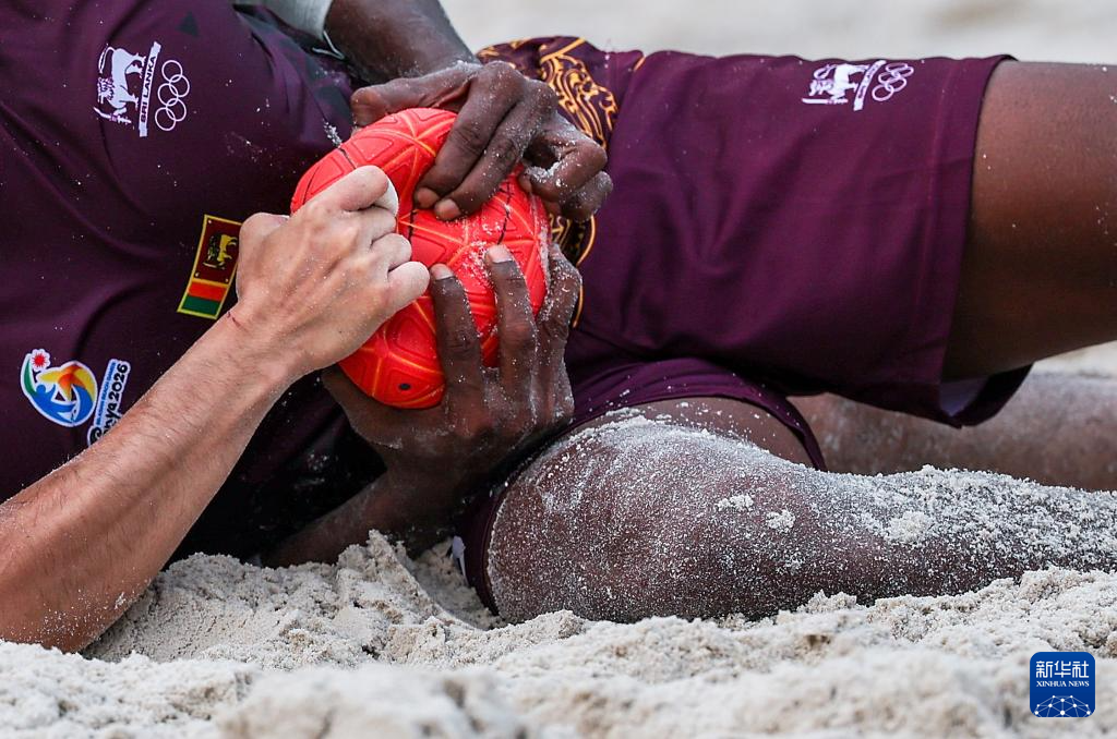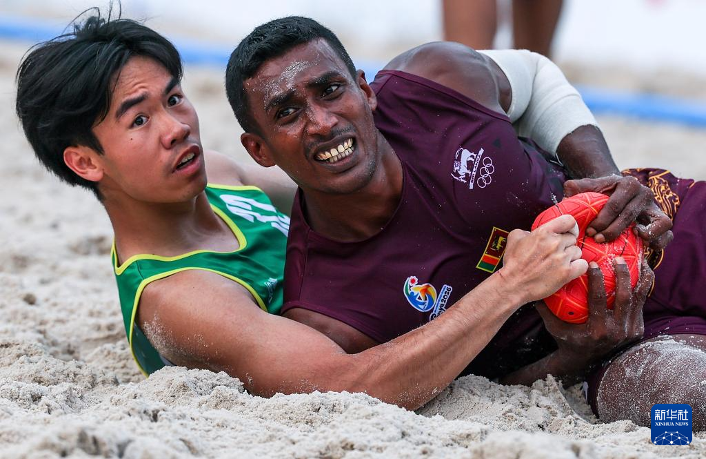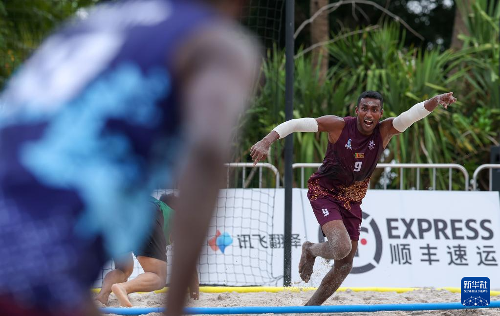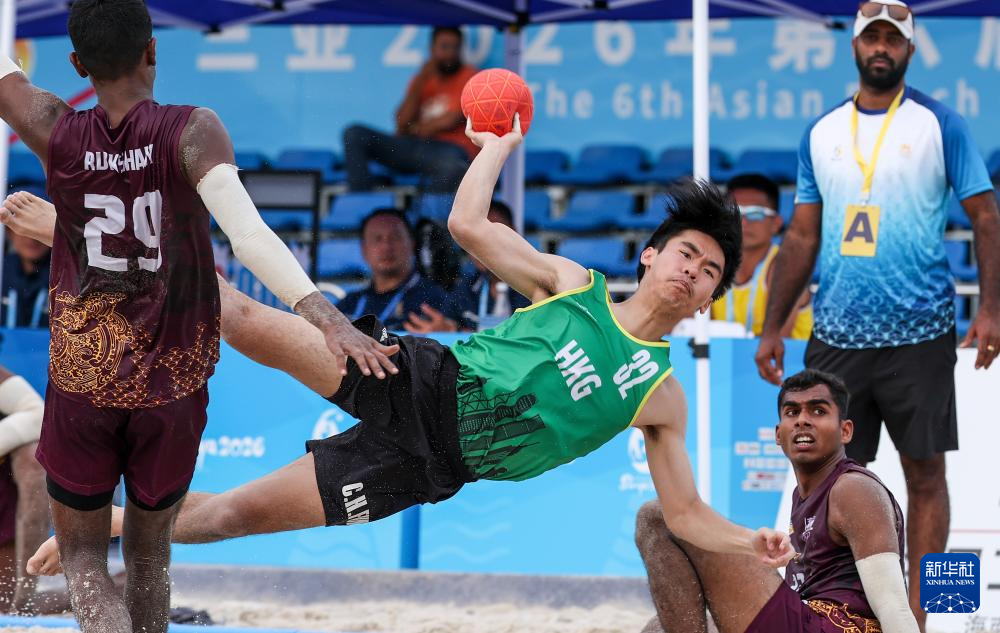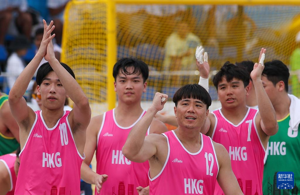 4月23日,在海南三亚举行的第六届亚洲沙滩运动会沙滩手球男子小组赛中,中国香港队2比1战胜斯里兰卡队。