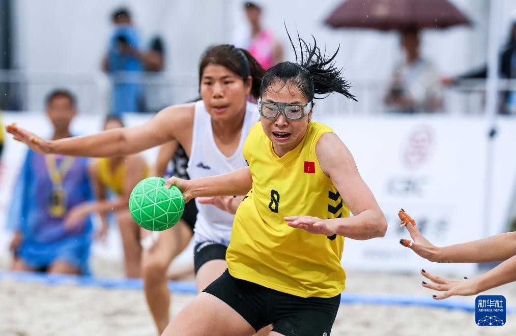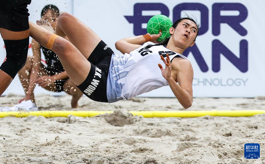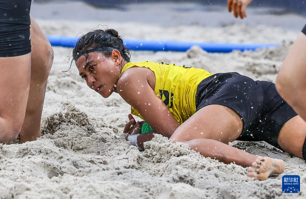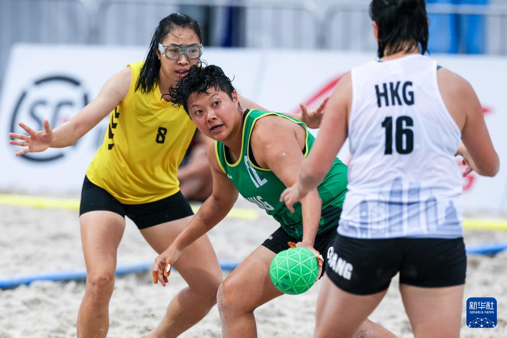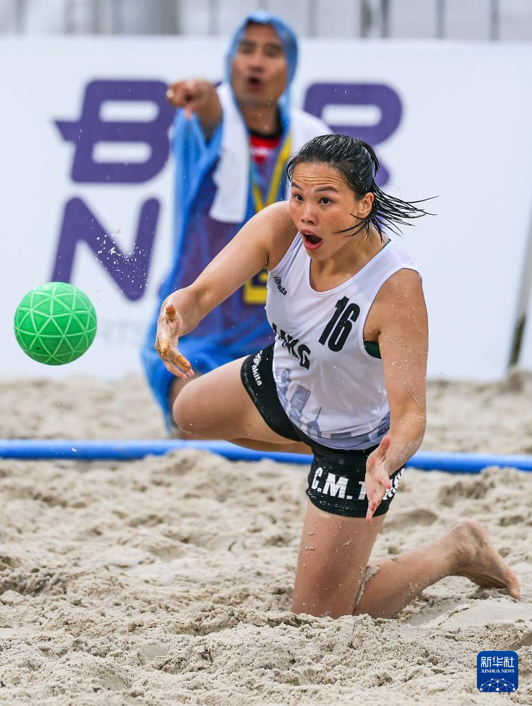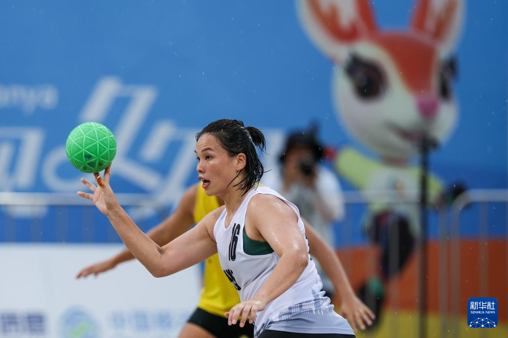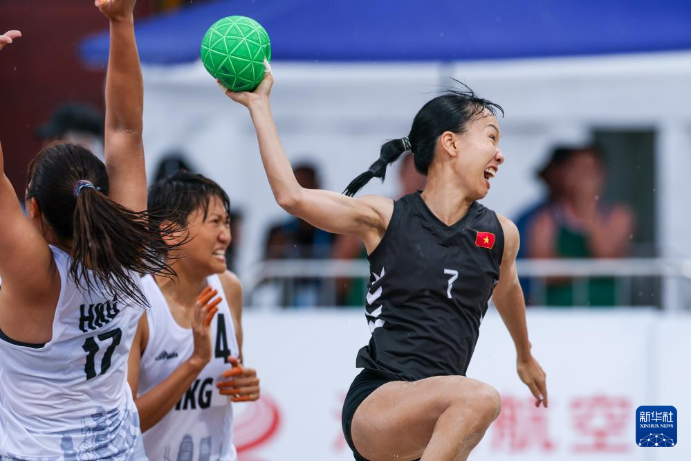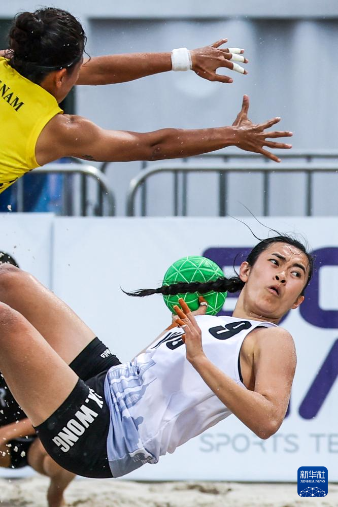4月24日,在海南三亚举行的第六届亚洲沙滩运动会沙滩手球女子小组赛中,越南队2比0战胜中国香港队。