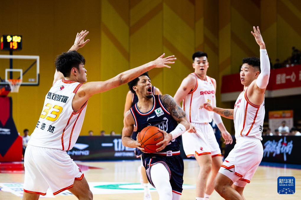 4月24日,广州朗肽海本队球员威金顿(中)在比赛中上篮受阻。