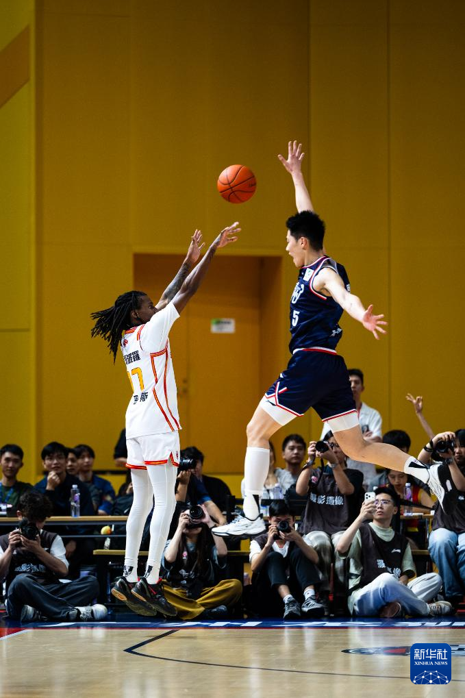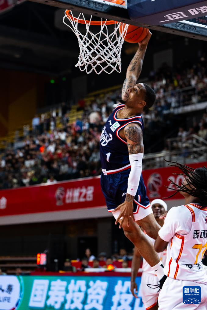 4月24日,广州朗肽海本队球员赛克斯(上)在比赛中扣篮。