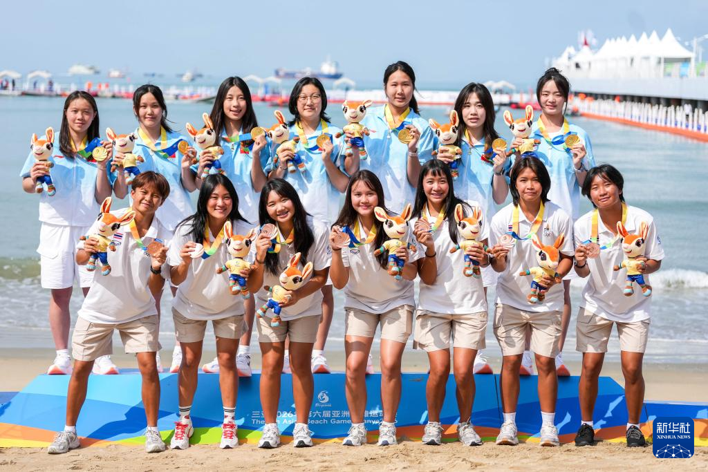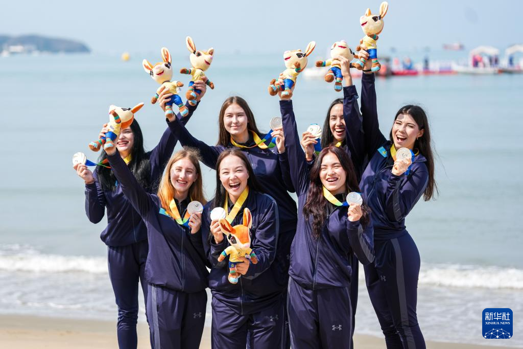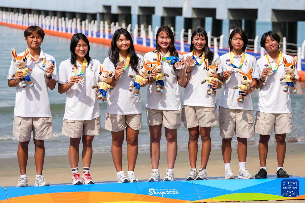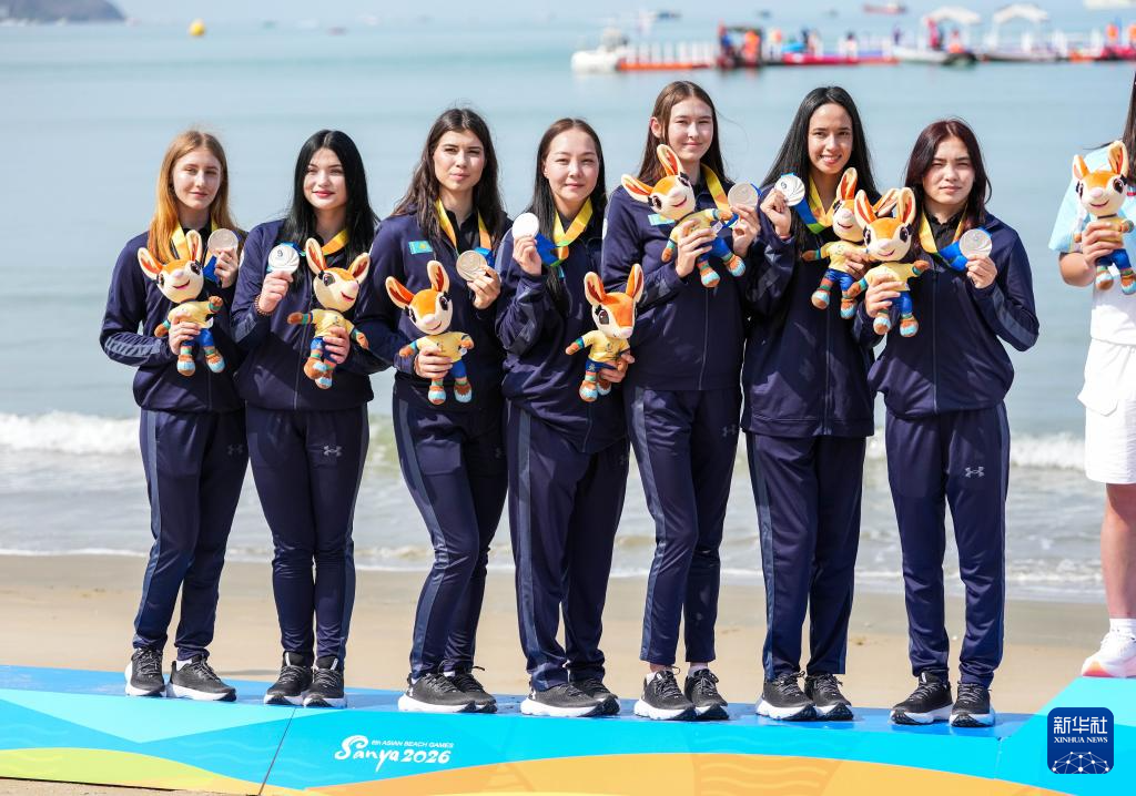 4月25日,第六届亚洲沙滩运动会女子水球颁奖仪式在海南三亚举行。中国队、哈萨克斯坦队、泰国队分获冠、亚、季军。